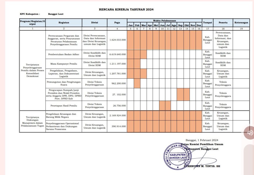 RENCANA KERJA KPU KAB. BANGGAI LAUT TAHUN 2024 Jumat, 02 Februari 2024 09:46 16 Dwonload Baca Selengkapnya