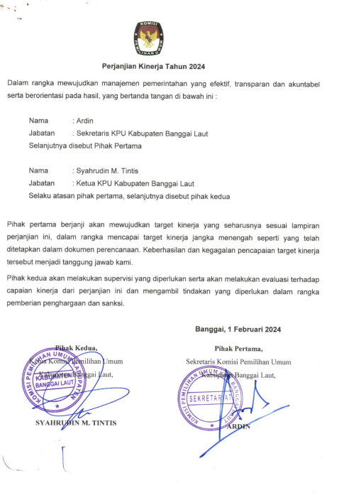 Perjanjian Kinerja Sekretaris KPU BAnggai Laut 2024 Minggu, 10 Maret 2024 21:00 74 Perjanjian Kinerja Sekretaris KPU BAnggai Laut 2024 Download Bagikan: Telah dilihat 74 kali