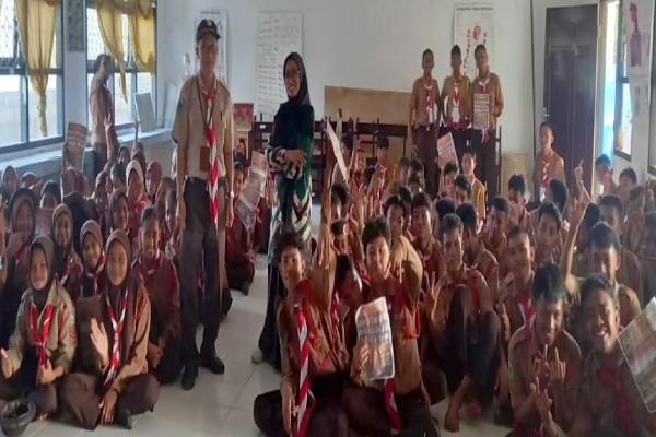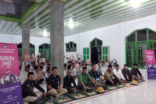 Di akhir nobar film kejarlah janji, Ketua bersama Anggota KPU Banggai Laut memberikan doorprize kepada para santri yang dapat menjawab quiz yang diberikan. (Humas KPU Banggai Laut,ikbal/foto:ikbal/ed:yudi)